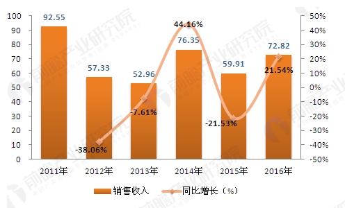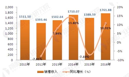 2011-2016年我國金屬機床行業銷售收入變化情況(單位:億元,%)