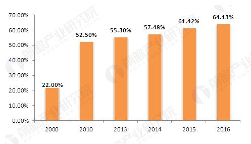 2000-2016年中國金屬切削機床產值數控化率(單位:%)