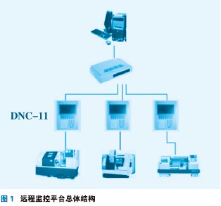 遠程監(jiān)控平臺是由一臺PC機、一個集線器、若干個DNC-11數(shù)控系統(tǒng)連接機床而成,形成一個星形的拓撲結構。遠程監(jiān)控平臺的總體結構如圖1所示。