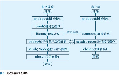 根據(jù)采用的通訊協(xié)議,并考慮到對通信可靠性和正確性的要求較高,本監(jiān)控平臺選用流式套接字來實現(xiàn)網(wǎng)絡通訊。基于Client /Server模式的流式套接字通訊過程如圖3 所示。