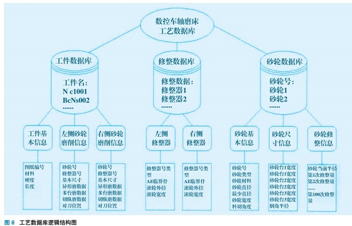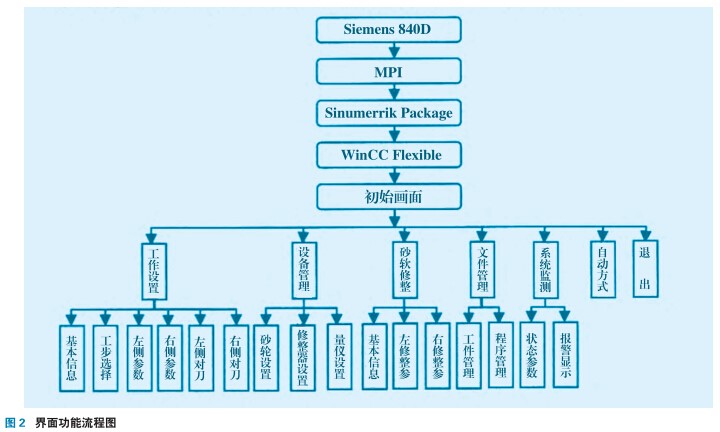 系統采用模塊化程序設計方法,既便于系統功能的各種組合和修改,又便于未參與開發的技術維護人員補充、維護。在系統功能分析的基礎上,根據西門子840D數控系統及WinCC Flexible組態軟件程序編制的特點,建立系統功能模塊結構,如圖8所示。分別采用工件名、砂輪號、修整器號作為各子數據庫的索引標志。