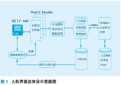 WinCC Flexible開發的用戶界面設計不僅僅是窗體本身的畫面外觀設計,重要的是底層內部腳本的編輯和整體的構架,通過合理的人性化構架來引導機床操作人員進行操作。怎樣通過腳本實現數據的處理、存儲及如何實現文件的管理?利用WinCC Flexible提供的VBS(Visual Basic Script)腳本開發的工藝數據庫管理軟件可對車軸磨削的工件數據、砂輪數據、修整數據等磨削工藝參數進行存儲和管理,加工數據最終以CVS(數據文件格式)數據流文件形式進行存儲。總體設計思路如圖1。