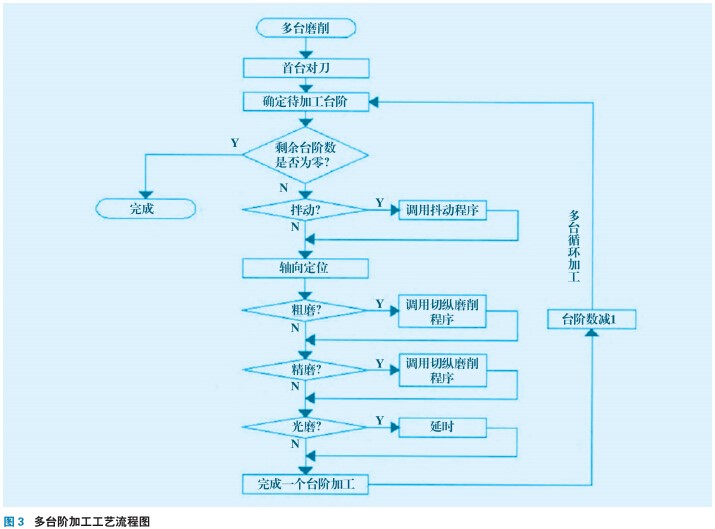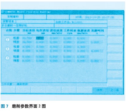 以多臺階零件加工為例,根據多臺加工工藝流程如圖3所示,首先進入加工參數預設界面,如圖4所示,輸入工件名稱后按照排序依次設定工件基本信息、工步選擇及左側磨削參數,如圖5、圖6、圖7所示。完成一個界面參數輸入后,點擊保存按鈕,初始界面上該界面的顯示狀態將由待設定變為設定完成,提示操作人員設定已完成。