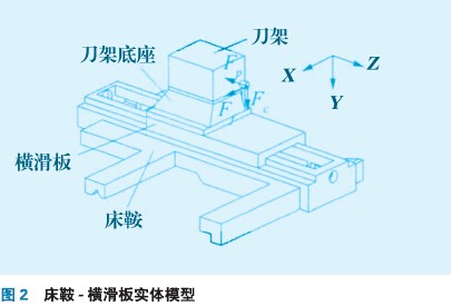 平床身數(shù)控車床主要由床身、床鞍、橫滑板、刀架、刀架底座、主軸箱和尾座七大支承部件組成,其結(jié)構(gòu)模型如圖1所示。在數(shù)控車床加工過程,主軸箱固定,工件由三爪卡盤夾緊并旋轉(zhuǎn),橫滑板沿著床鞍X向運動,床鞍沿床身Z向運動。