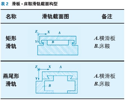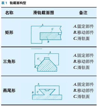 滑軌聯(lián)接的截面構(gòu)型指滑軌縱向橫截面上所具有的不同形狀。機床滑軌聯(lián)接面有多種不同的構(gòu)型,常用的有矩形滑軌、三角形滑軌和燕尾形滑軌等,如表1所示。