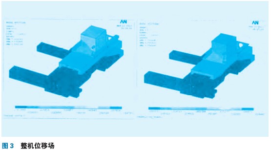 有限元靜力計算是分析研究對象在靜態(tài)載荷作用下的位移和應(yīng)力。用ANSYS分析軟件完成床鞍橫滑板的邊界條件設(shè)置、載荷的施加,對其進行靜力計算。本文主要對機床位移場進行數(shù)據(jù)提取,位移場如圖3所示。