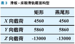 車床床鞍與橫滑板的滑軌連接,常用的截面構(gòu)型有矩形滑軌和燕尾形滑軌。對床鞍一橫滑板實體模型分別采用矩形滑軌和燕尾型滑軌聯(lián)接,共進行兩次有限元靜力計算。截面構(gòu)型如表2所示。