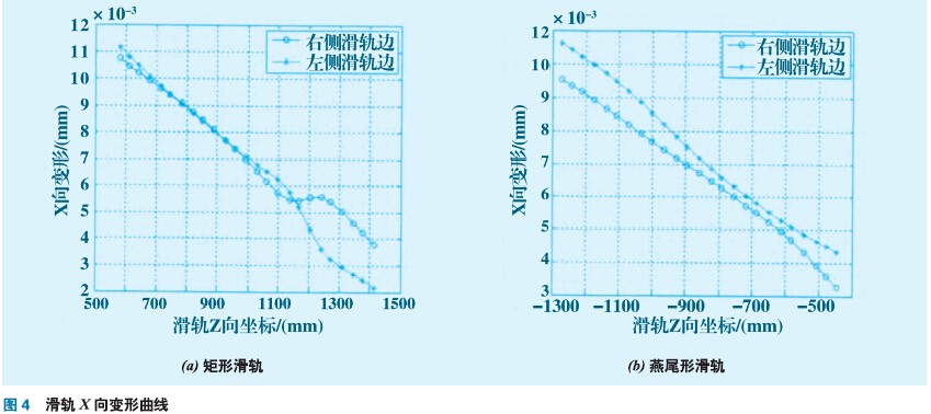 以滑軌聯(lián)接面長度方向為坐標系的X軸,滑軌X向位移為Y軸,繪制滑軌兩側(cè)邊X向變形曲線如圖4所示。