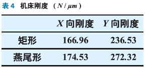 由表4可知,矩形滑軌機床的X向剛度為166.96N/μm,燕尾形滑軌機床的X向剛度為174.53N/μm。因此,燕尾形滑軌機床X向剛度高于矩形滑軌。