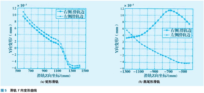 機床Y向剛度是受滑軌結(jié)構(gòu)Y向剛度與X/Y向抗彎剛度影響的。提取滑軌聯(lián)接面兩側(cè)邊Y向位移,分析滑軌聯(lián)接面對機床Y向剛度的影響。以滑軌聯(lián)接面長度方向坐標為X軸,滑軌兩側(cè)邊Y向位移為Y軸,繪制滑軌Y向變形曲線如圖5所示。