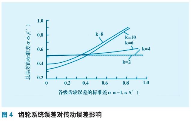 當(dāng)進(jìn)給傳動(dòng)系統(tǒng)的齒輪全部采用5級(jí)精度時(shí),齒輪進(jìn)給傳動(dòng)系統(tǒng)傳動(dòng)誤差折算到輸出軸上的傳動(dòng)誤差是0.49691′,此時(shí),由式(8)計(jì)算出的進(jìn)給傳動(dòng)系統(tǒng)的精度可靠度為69.22%。當(dāng)進(jìn)給傳動(dòng)系統(tǒng)的第一級(jí)齒輪采用6級(jí)精度、其余齒輪采用5級(jí)精度時(shí),齒輪進(jìn)給傳動(dòng)系統(tǒng)傳動(dòng)誤差折算到輸出軸上的傳動(dòng)誤差是0.49696′,此時(shí),由式(8)計(jì)算出的進(jìn)給傳動(dòng)系統(tǒng)的精度可靠度也是69.22%。當(dāng)進(jìn)給傳動(dòng)系統(tǒng)的最后一級(jí)齒輪副采用4級(jí)精度、其余齒輪采用5級(jí)精度時(shí),齒輪進(jìn)給傳動(dòng)系統(tǒng)傳動(dòng)誤差折算到輸出軸上的傳動(dòng)誤差是0.42001′,由式(8)計(jì)算出的進(jìn)給傳動(dòng)系統(tǒng)傳動(dòng)誤差的可靠度為